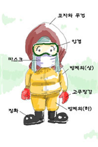 농약은 어떤 다른 부위보다 피부를 통해서 흡수가 잘되기 때문에 방수성 의복으로 몸의 노출 부위를 감싸주어야 한다. 반드시 고무장갑, 마스크, 모자, 긴소매의 웃옷과 긴바지, 고무 장화를 착용해야 한다. 보호용 방제복으로는 우리가 흔히 땀복이라 부르는 비교적 가볍고 시원하게 입을 수 있는 제품을 이용한다.